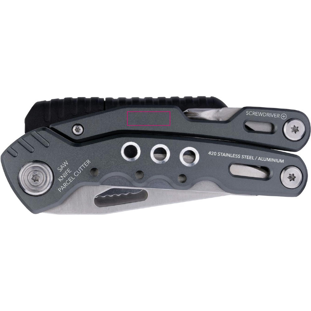 Multifunktions-Werkzeug mit 14 Funktionen, integrierte Feder und Feststellfunktion, Spitzzange, Zange, SeitenSCHNEIDER, Messer, Säge, Schere, Paketmesser, Schlitzschraubendreher in 2 Größen, Flaschenöffner, Kreuzschraubendreher, Feile, Feuerstahl, Pfeife. In Nylontasche mit Gürtelschlaufe.