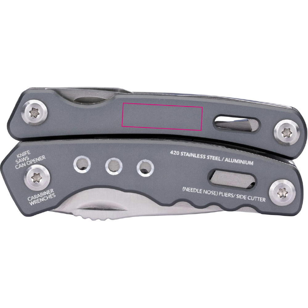 Multifunktions-Werkzeug Rucksack Tool mit 15 Funktionen, integrierte Feder und Feststellfunktion, Spitzzange, Zange, Seitenschneider, Messer, Säge, Schlitzschraubendreher, Dosenöffner, Feile, Karabiner, Flaschenöffner, Sechskant-Schraubenschlüssel, Werkzeuge im eingeklappten Zustand außenliegend, in Nylontasche mit Gürtelschlaufe, 420 Edelstahl, Aluminium, eloxiert, matt.