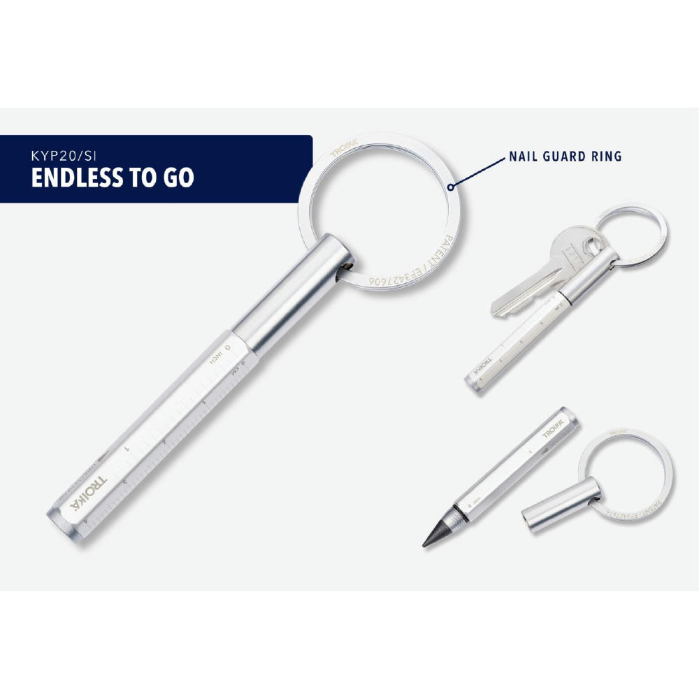 Multitasking-Bleistift und Schlüsselanhänger mit nachhaltiger Endlos-Schreibspitze (ca. 20km Schreiblänge), schnelles & einfaches Anbringen der Schlüssel dank patentiertem Öffnungsmechanismus (TROIKA NAIL GUARD), Zentimeter-/Zoll-Lineal, HB, radierbar, ohne Anspitzen, Schreibspitze austauschbar, Aluminium, matt, silberfarben