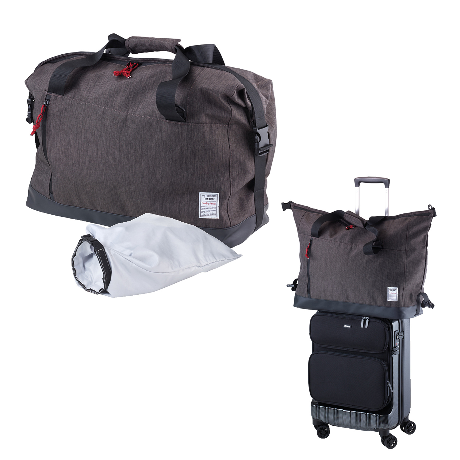 Reisetasche mit Reißverschluss-Hauptfach und 3 Stecktaschen, inkl. Wäschebeutel, Fronttasche mit Reißverschluss, 2 Tragegriffe, abnehmbarer, verstellbarer Schultergurt, seitliche Steckverschlüsse zur Versteifung bei kompletter Befüllung, Schlaufe zur Befestigung am Trolley, abgesetzter Standboden, Kapazität ca. 50 Liter, Tragkraft bis zu 15 kg. Material: Polyester. Farben: anthrazit, schwarz. Maße: 41 x 65 x 19 x cm, Gewicht: 850 g
