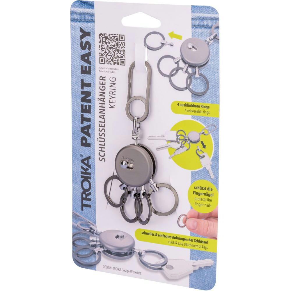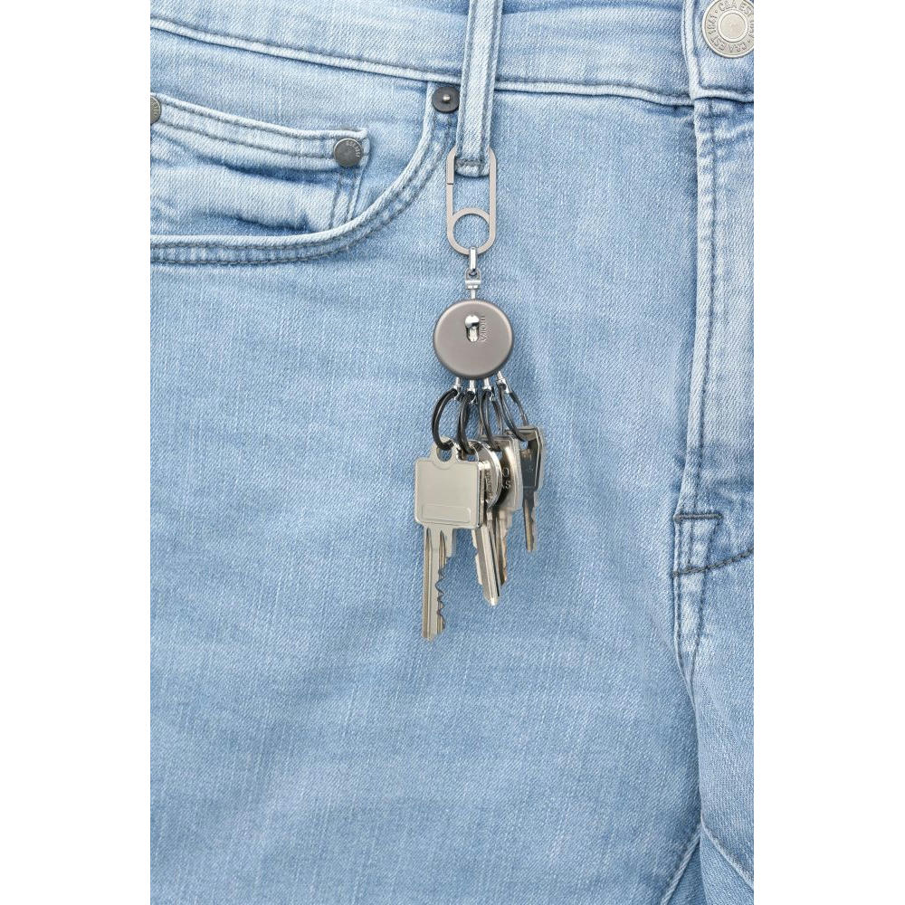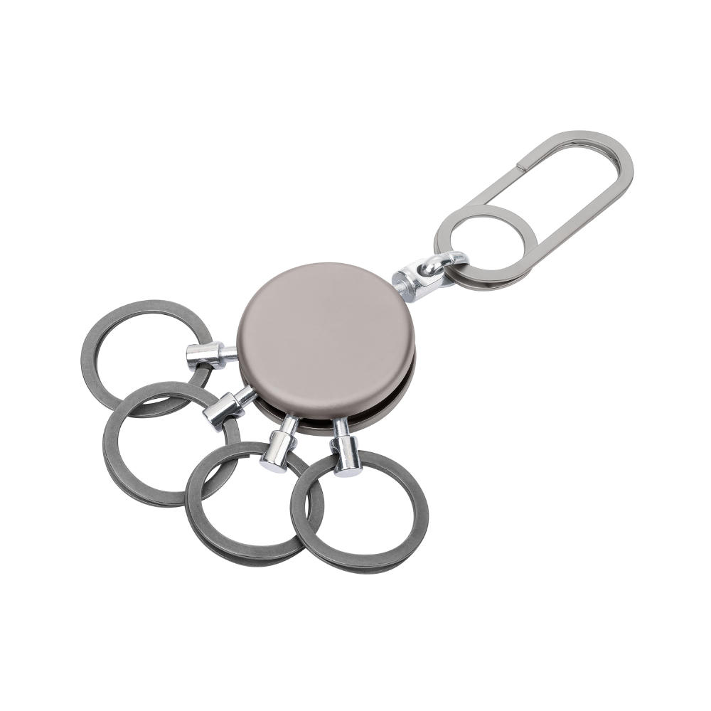 Schlüsselanhänger, rund, inkl. Karabinerhaken, 4 ausklinkbare Ringe, schnelles & einfaches Anbringen der Schlüssel dank patentiertem Öffnungsmechanismus (Nail Guard), Messing, Metall, verchromt, matt, gunmetal.