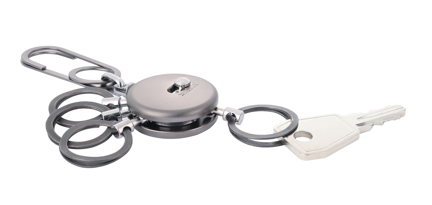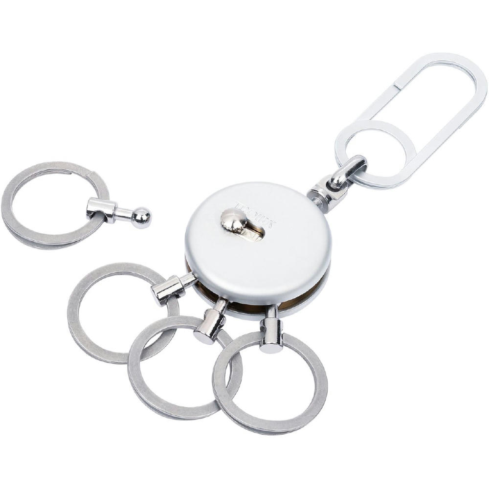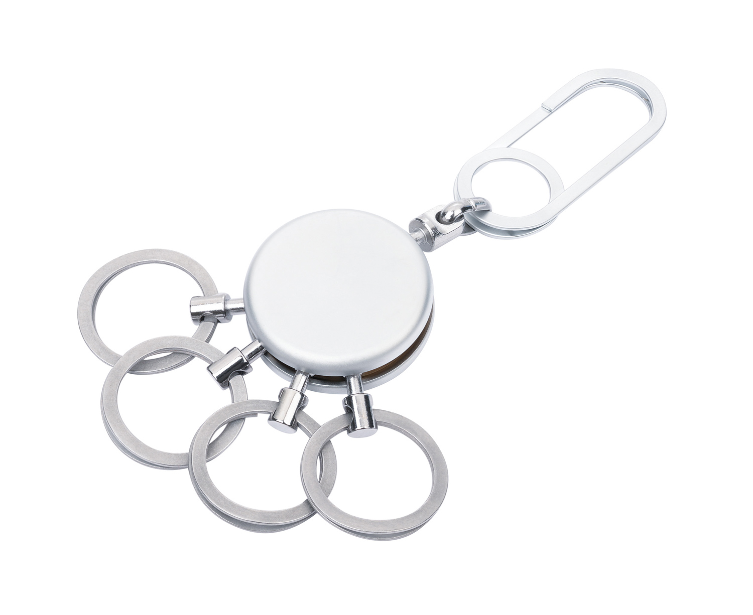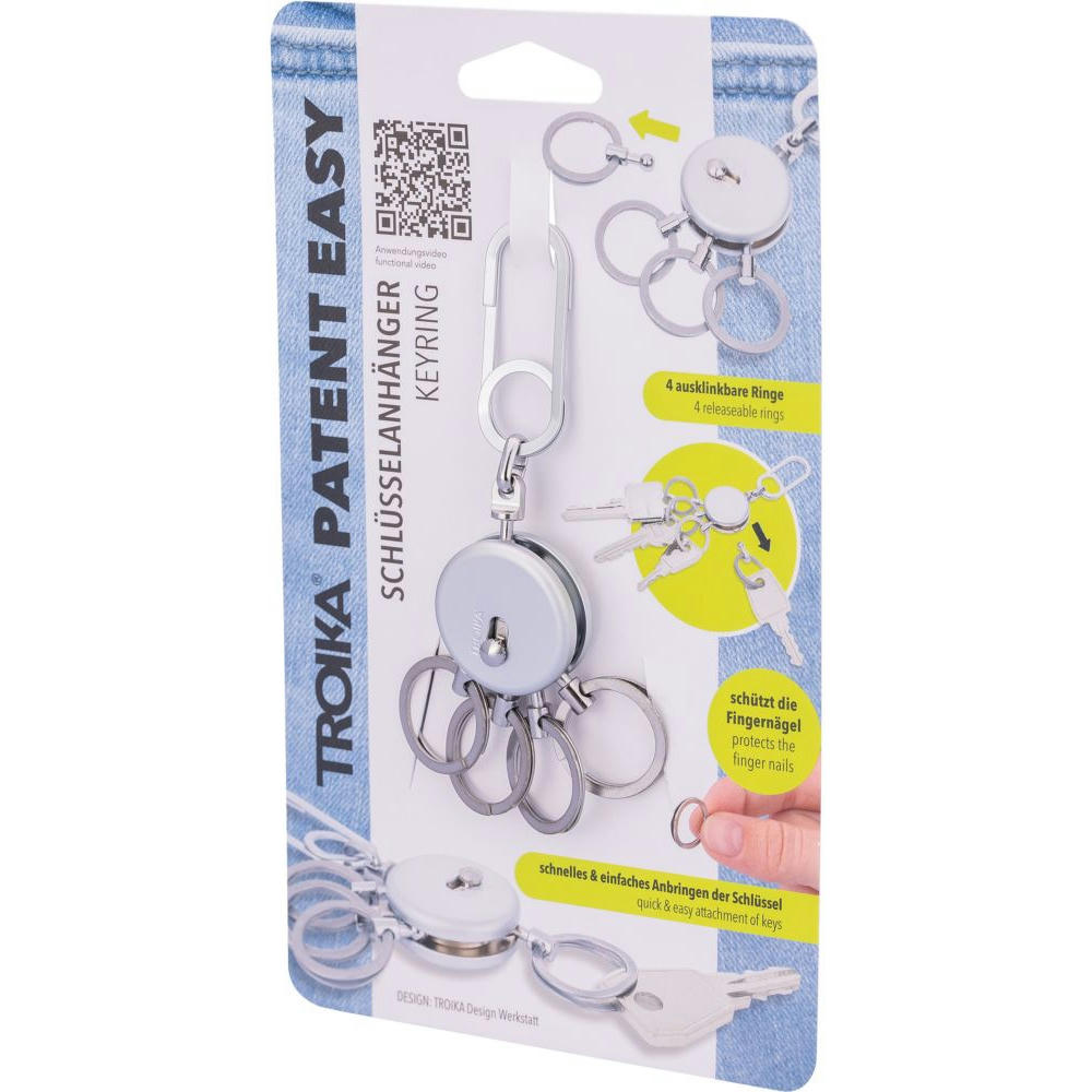 Schlüsselanhänger, rund, inkl. Karabinerhaken, 4 ausklinkbare Ringe, schnelles & einfaches Anbringen der Schlüssel dank patentiertem Öffnungsmechanismus (TROIKA NAIL GUARD), Messing, Metall, verchromt, matt, silberfarben