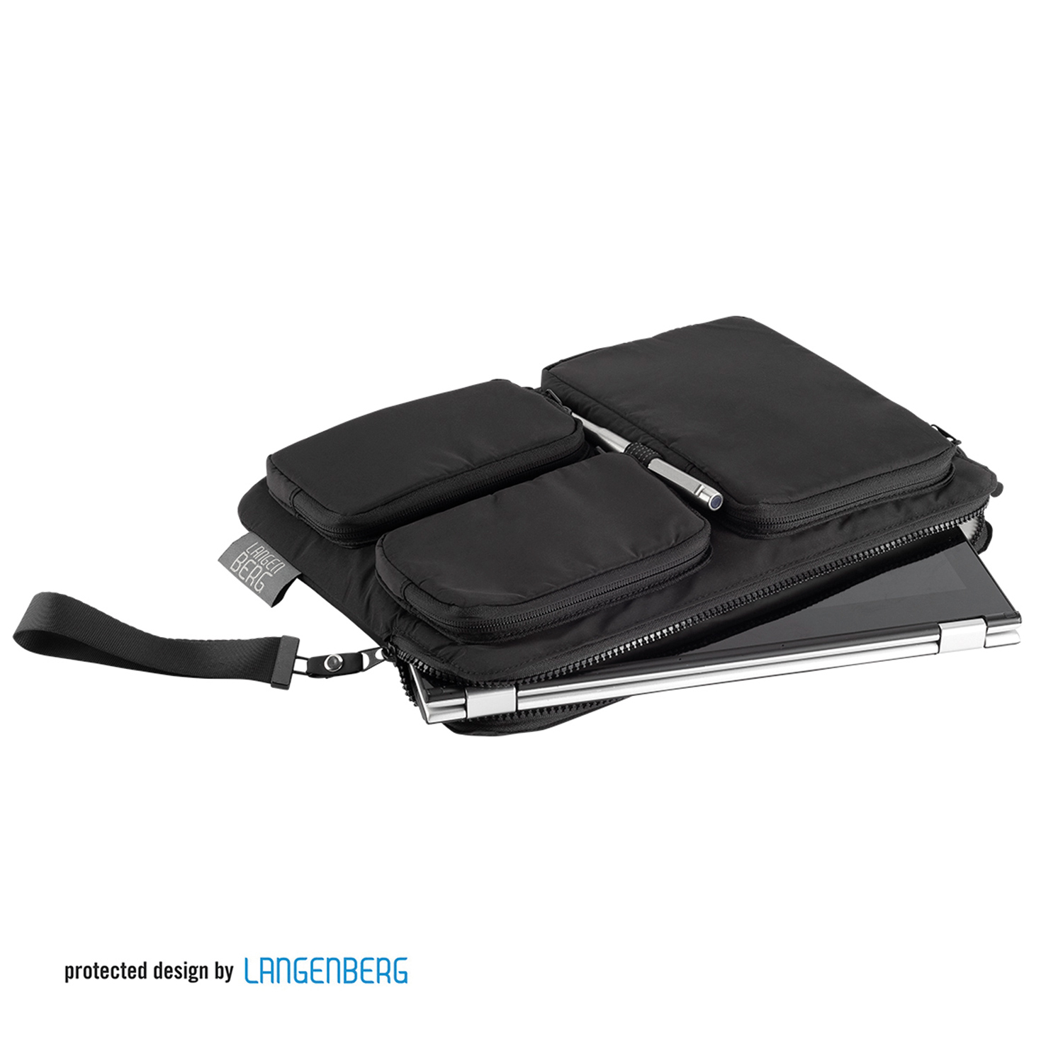 gepolstertes Reißverschlusshauptfach (passend bis 11") senkrechte Reißverschlussvortasche ca. 20 x 14 x 2 cm zwei waagrechte Reißverschlussvortaschen ca. 9,5 x 14,5 x 2 cm Volumen: ca. 2l