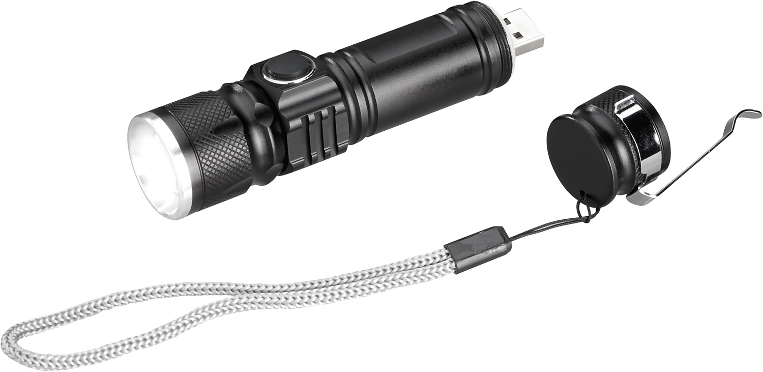 Die 1.200 mAh Batterie ist per Kabel wiederaufladbar. Leistung: 3 W. Lumen: 300. 3 Lichtmodi und Zoom-Funktion.