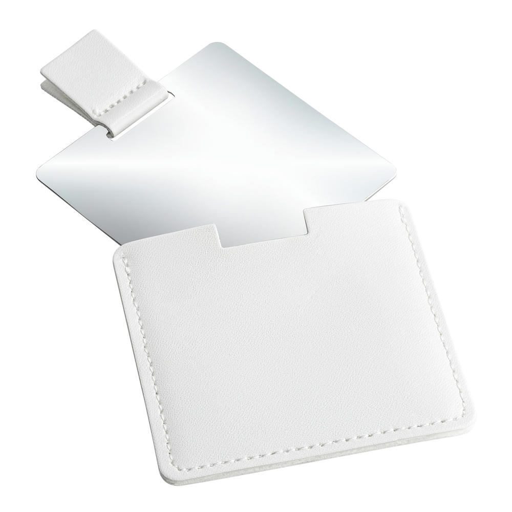 Ein Must-Have für alle, die Wert auf ein gepflegtes Äußeres legen. Mit dem handlich leichten Taschenspiegel können Sie unterwegs jederzeit Ihre Frisur überprüfen, Make-Up kontrollieren oder Lippenstift schnell auffrischen. Der bruchsichere Edelstahl-Spiegel bietet auf der einen Seite eine hochglanzpolierte, auf der anderen eine gebürstete Oberfläche. In einer Kunstleder-Hülle ist der Spiegel sicher aufbewahrt und lässt sich dank der Grifflasche mühelos herausziehen. Die Hülle mit Ziernaht ist in edlem Schwarz oder Weiß erhältlich und überzeugt durch ihre angenehme Haptik.