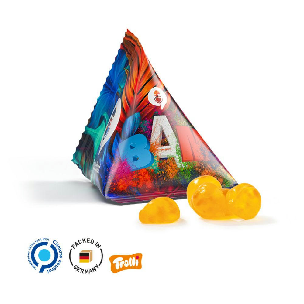 Trolli Fruchtgummi im Tetraeder aus transparenter Folie, individuell bedruckt. Inhalt: Trolli Fruchtgummi mit Fruchtsaft und Fruchtstückchen mit 10 Vitaminen in der Geschmacksrichtung Pfirsich, 15 g