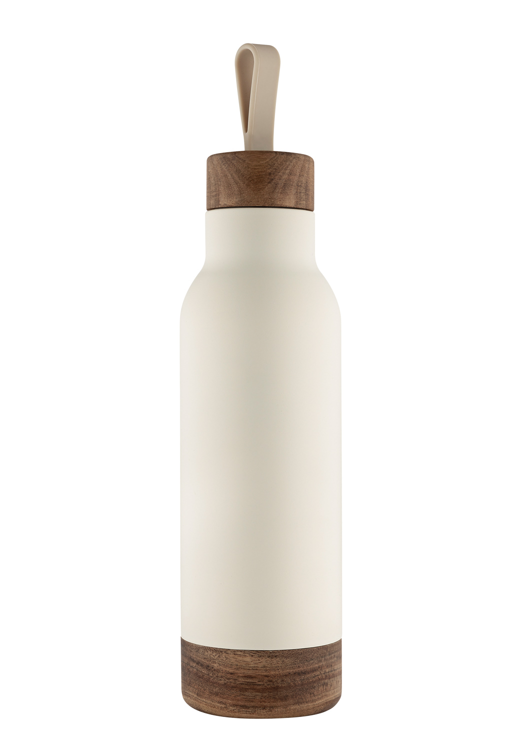 Doppelwandige vacuumisolierte Trinkflasche – hält ca. 10 h kalt/8 h heiß – auslaufgeschützt, pulverbeschichtet mit Akazienholzapplikationen (aus kontrolliertem Anbau) & aus recyceltem Edelstahl außen (> 80 %), im Designkarton.
