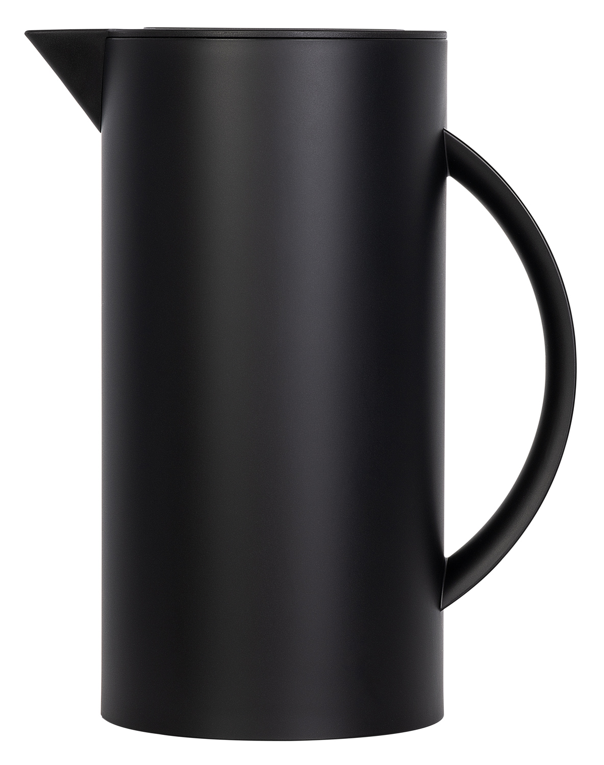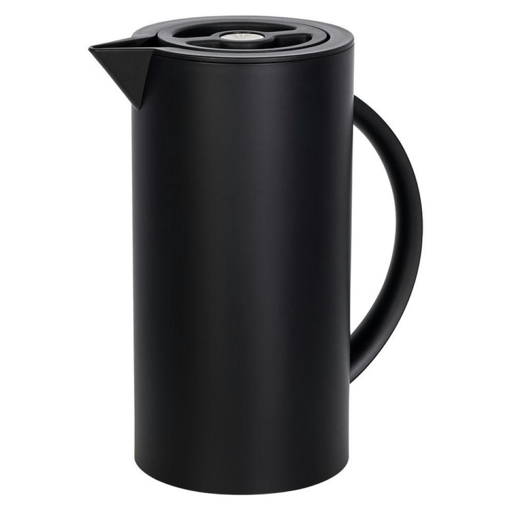 Schwarz matte Thermoskanne mit verspiegeltem Glaskolben als Isolierbehälter. Schraubdeckel mit Druckknopf für komfortables Ausgießen.