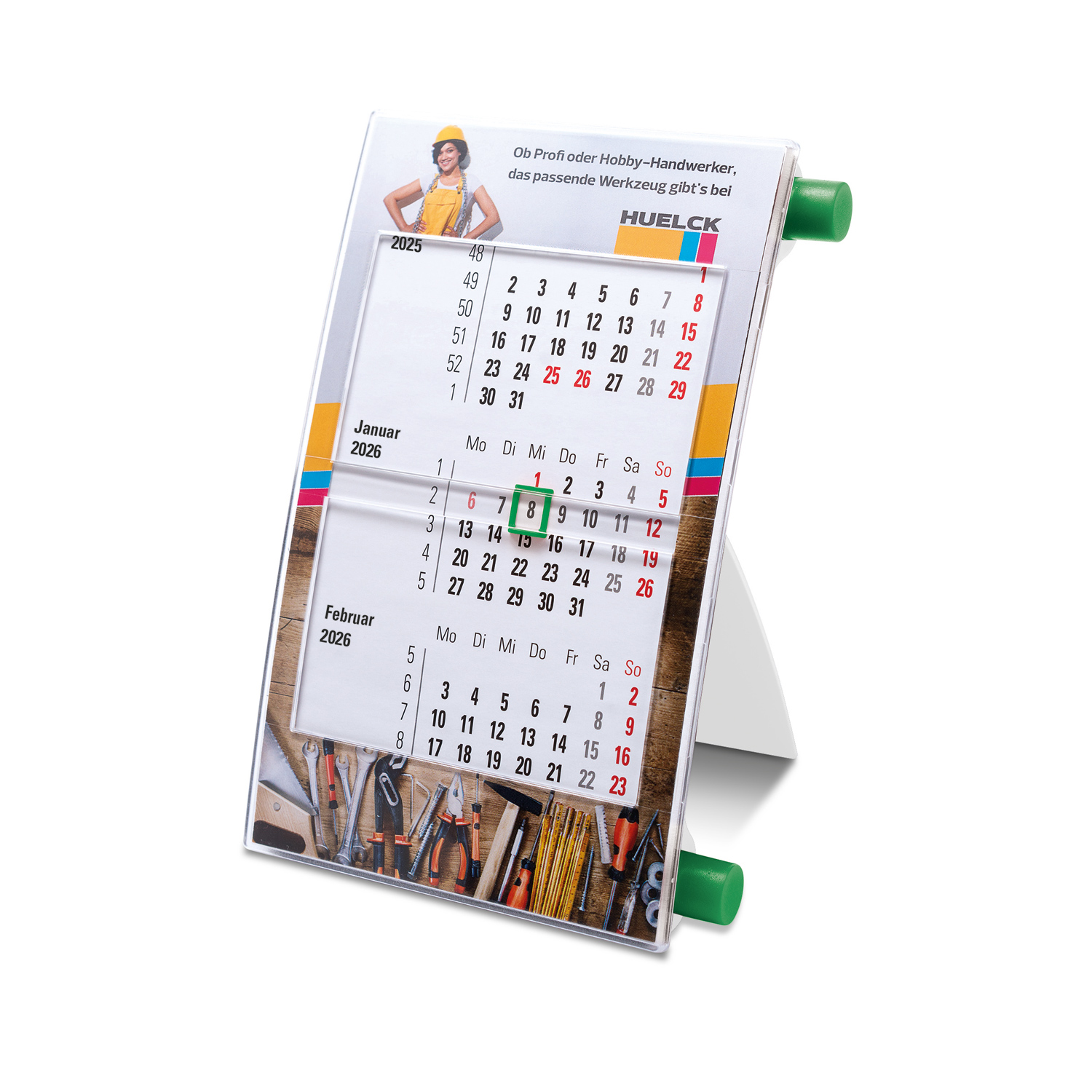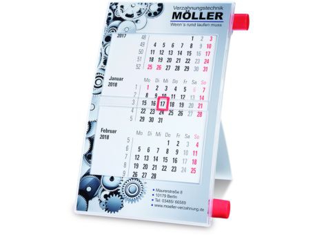 Tischdrehkalender mit eleganter Form, klarem Sichtfeld und individuell gestaltbarem 4c-Einleger gegen Aufpreis. Made in Germany.