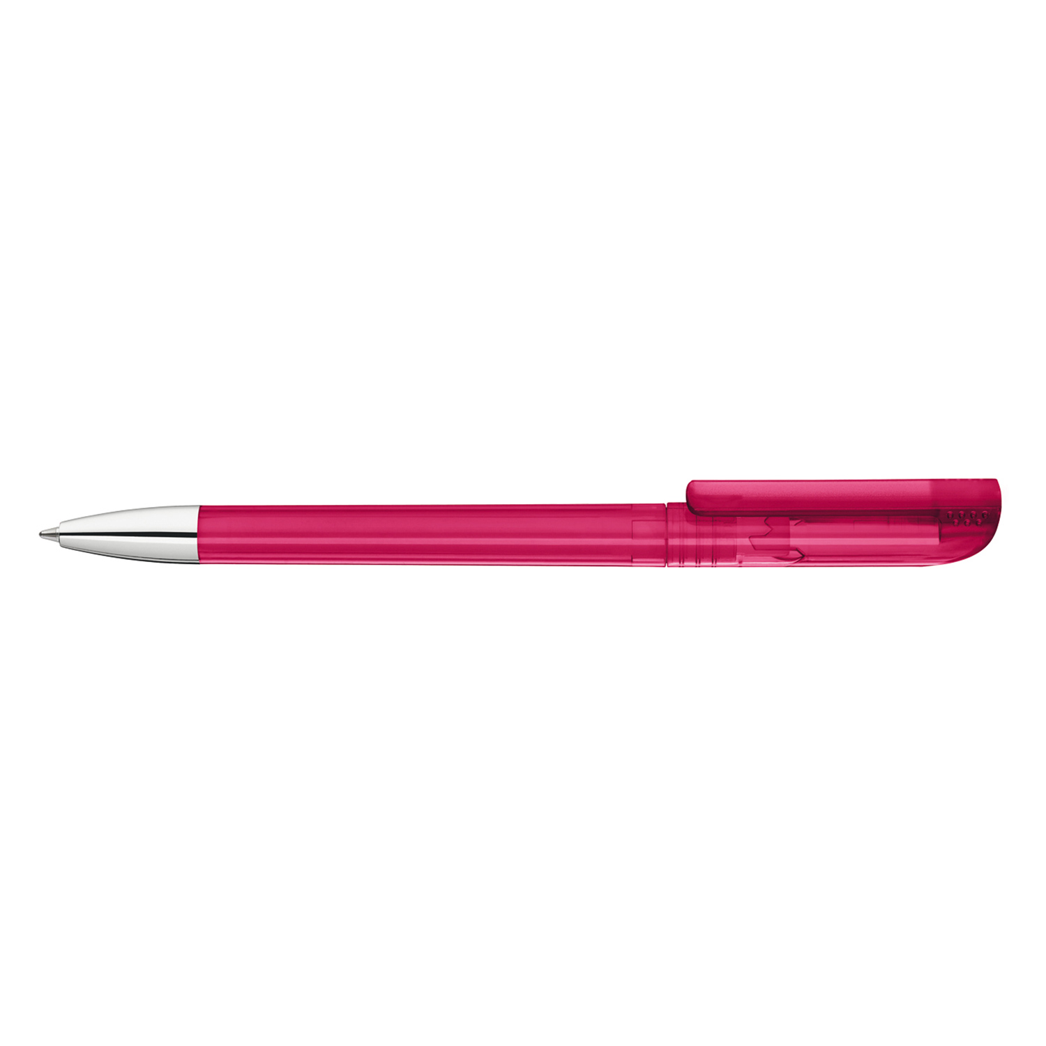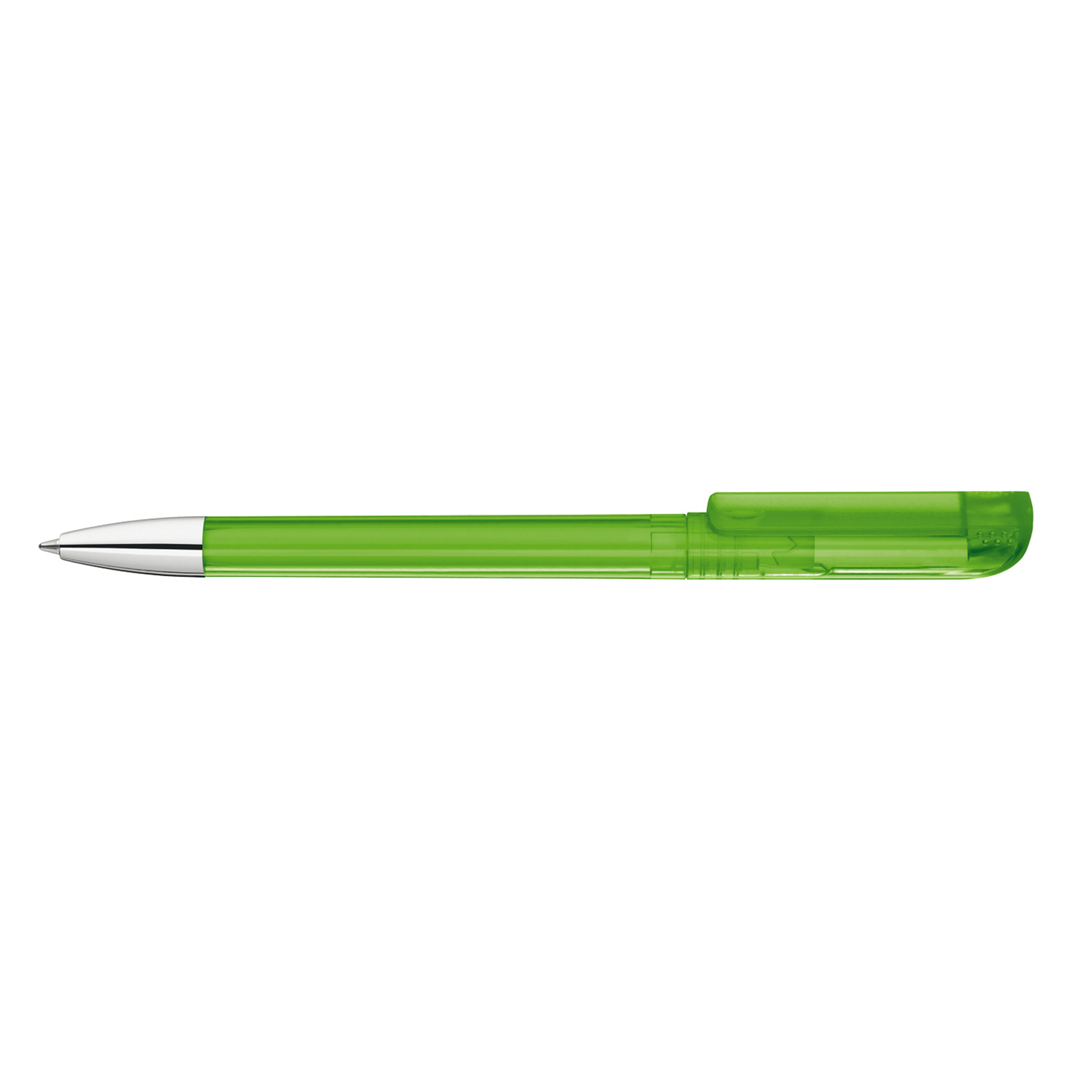 Drehkugelschreiber mit transparent glänzendem Gehäuse, gefrosteter Clipoberfläche und Spitze glanzverchromt.