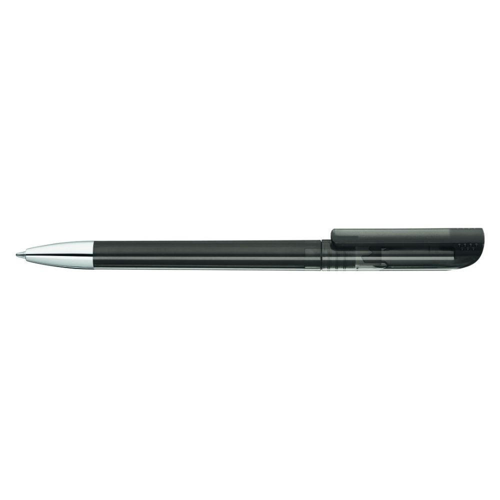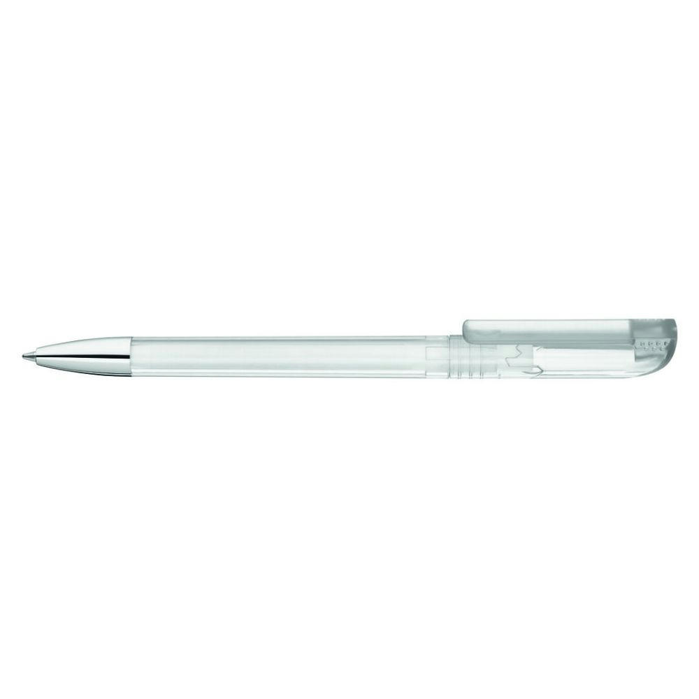Drehkugelschreiber mit transparent glänzendem Gehäuse, gefrosteter Clipoberfläche und Spitze glanzverchromt.