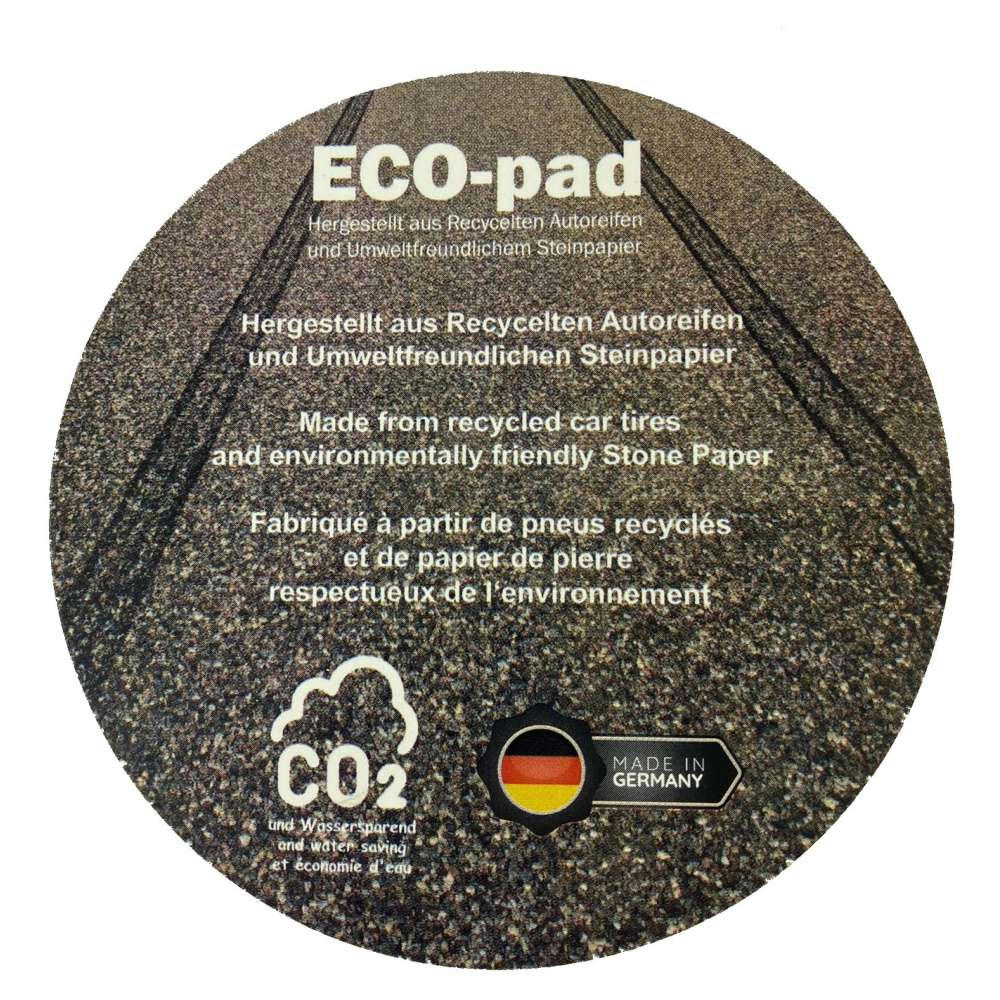 Unterseite aus 100 % in Deutschland recycelten Autoreifen ( 75 % Anteil vom Artikel), Oberfläche aus umweltfreundlichem Steinpapier, das in der Herstellung nur einen Bruchteil der Energie und Wasser benötigt. CO2 wird bei Steinpapier = 474 KG und bei normalem Papier ca. 1431 KG produziert. Made in Germany. Preis inkl. Druck auf der Vorderseite.