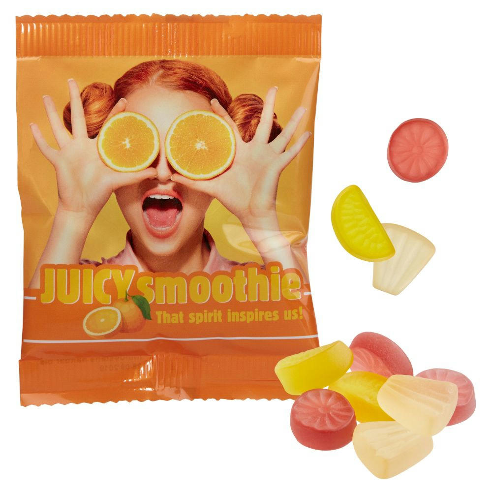 Veganes Fruchtgummi ohne Gelatine, mit Aromen und färbenden Pflanzenauszügen, farblich und geschmacklich bunt gemischt, in glänzend- oder matt-kaschiertem transparentem alternativ weißem Werbetütchen verpackt. Haltbarkeit: ca. 12 Monate bei sachgerechter Lagerung. Preis inkl. 1-5c-Druck.