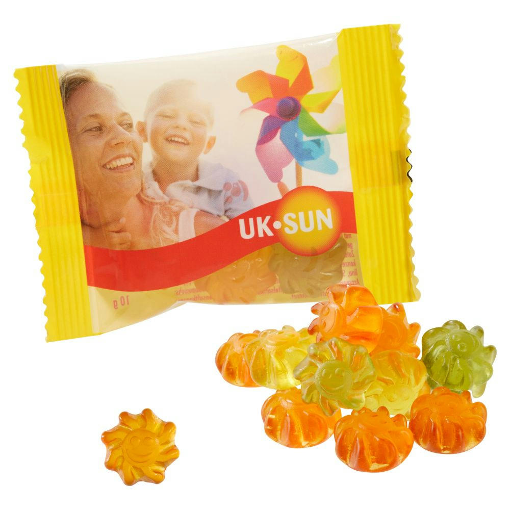 Fruchtgummi mit Aloe Vera und Ballaststoffen aus der Chicoréewurzel, mit natürlichen Aromen und färbenden Pflanzenauszügen, ohne Gelatine, farblich und geschmacklich bunt gemischt, in glänzend- oder matt-kaschiertem transparenten alternativ weißen Werbetütchen verpackt. Haltbarkeit: ca. 12 Monate.