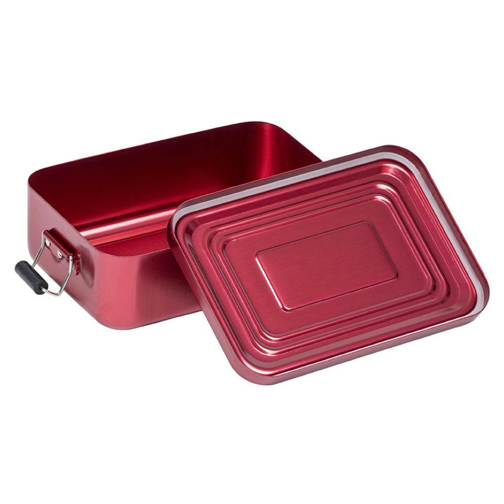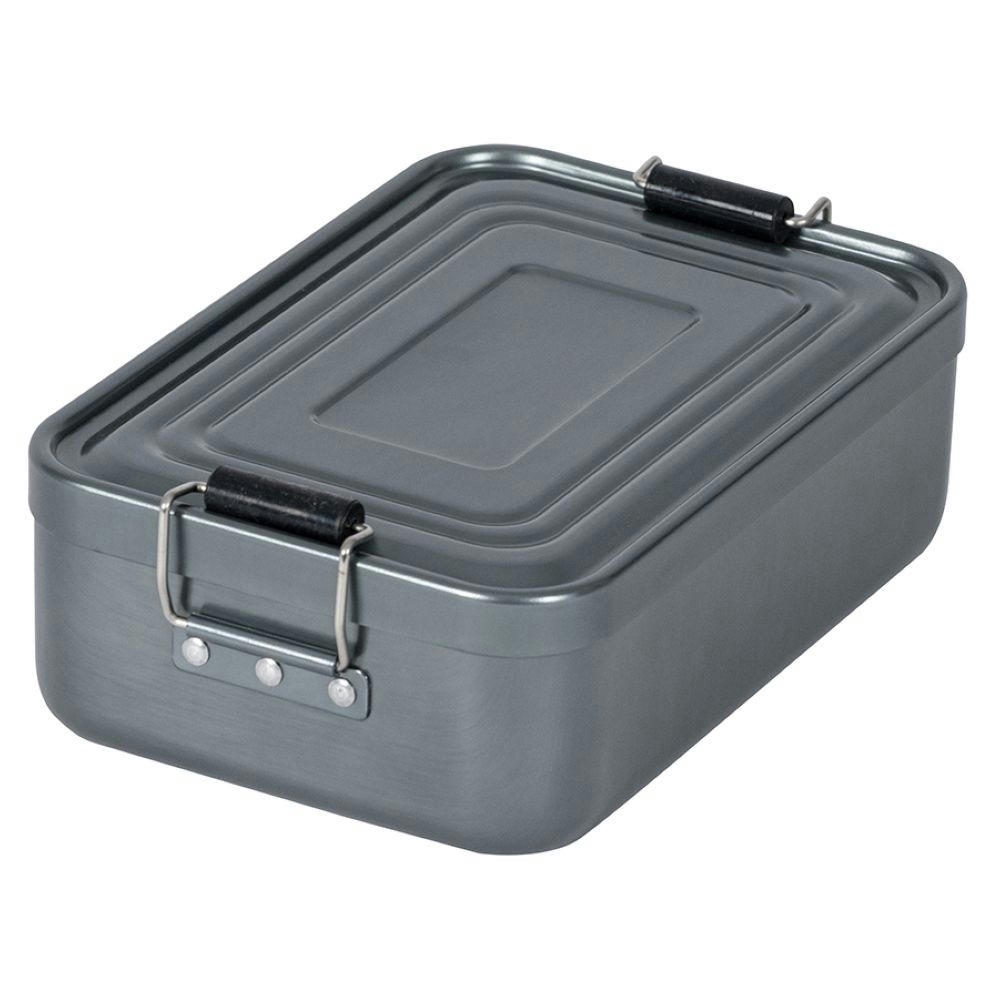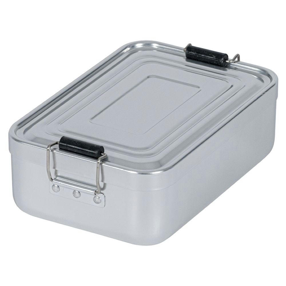 Lunchbox aus Aluminum mit zwei Klemmbügel für sicheres Verschließen. Deckel komplett abnehmbar mit Silikondichtung. Volumen: ca. 1.100 ml; Maße: 17,9 x 11,6 x 5,5 cm