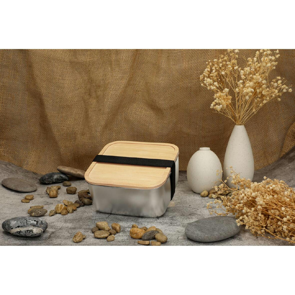 Stylische Lunchbox mit einer Schale aus Edelstahl und einem Deckel aus Bambus. Verschlossen wird die Box mittels eines schwarzen Gummibands.