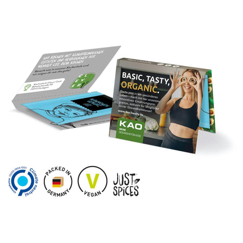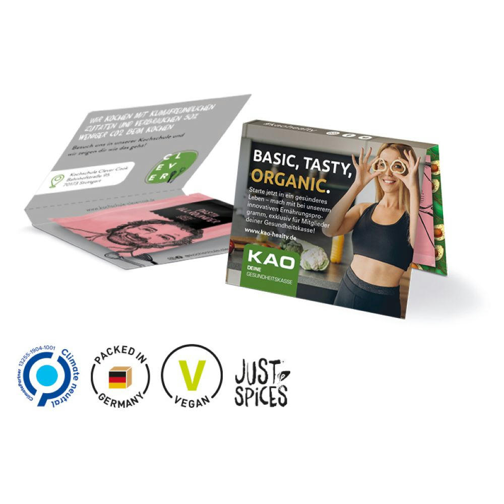 Werbekarte Midi aus weißem Karton und mit praktischer Abreißperforation, individuell bedruckt. Inhalt: Just Spices Stullenspice Gewürztütchen mit Brot-Würzmischung, 5 g,