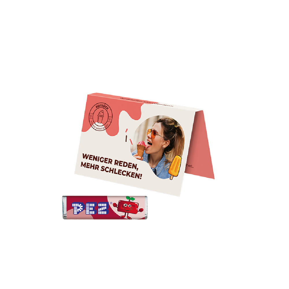 Aufklappbare Werbekarte im Visitenkartenformat, weißer Karton, mit praktischer Abreißperforation, individuell bedruckt. Inhalt: 1 PEZ Bonbonriegel, Zitrone (nur sortenrein), 8,5 g