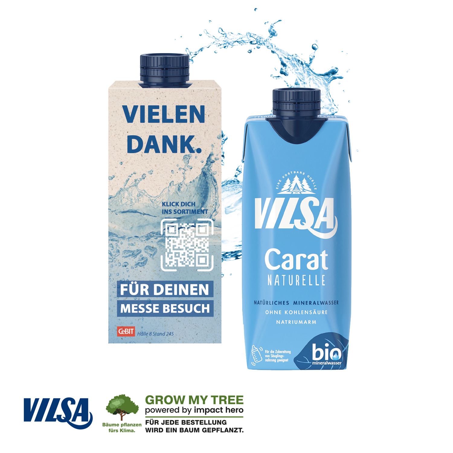 VILSA Bio Mineralwasser Naturelle verpackt in einer individuellen Werbekartonage. Mit ihrer Leichtigkeit und Wiederverschließbarkeit ist die Kartonverpackung das perfekte Präsent. Inkl. individuell 4c-rundum bedruckter Werbekartonage. Für jede Bestellung wird ein Baum über GROW MY TREE gepflanzt.