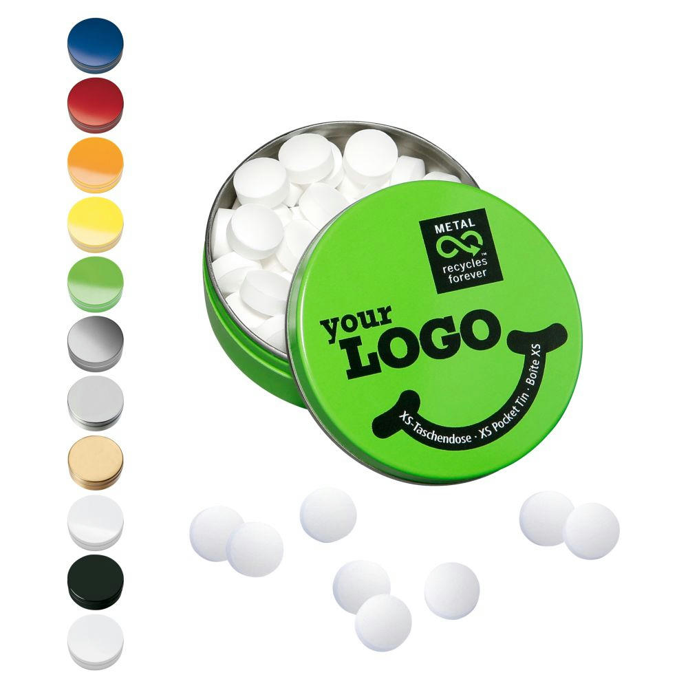 Metalldose aus 99 % recyclebarem Weißblech in 11 Farben und 6 verschiedenen Füllvarianten, wiederbefüllbar, einzeln gesleevt mit Aufreißhilfe. Inhalt: ca. 18 g zuckerfreie Pfefferminz-Pastillen. Haltbarkeit: 18 Monate. Weitere Marken-Füllvarianten auf Anfrage.