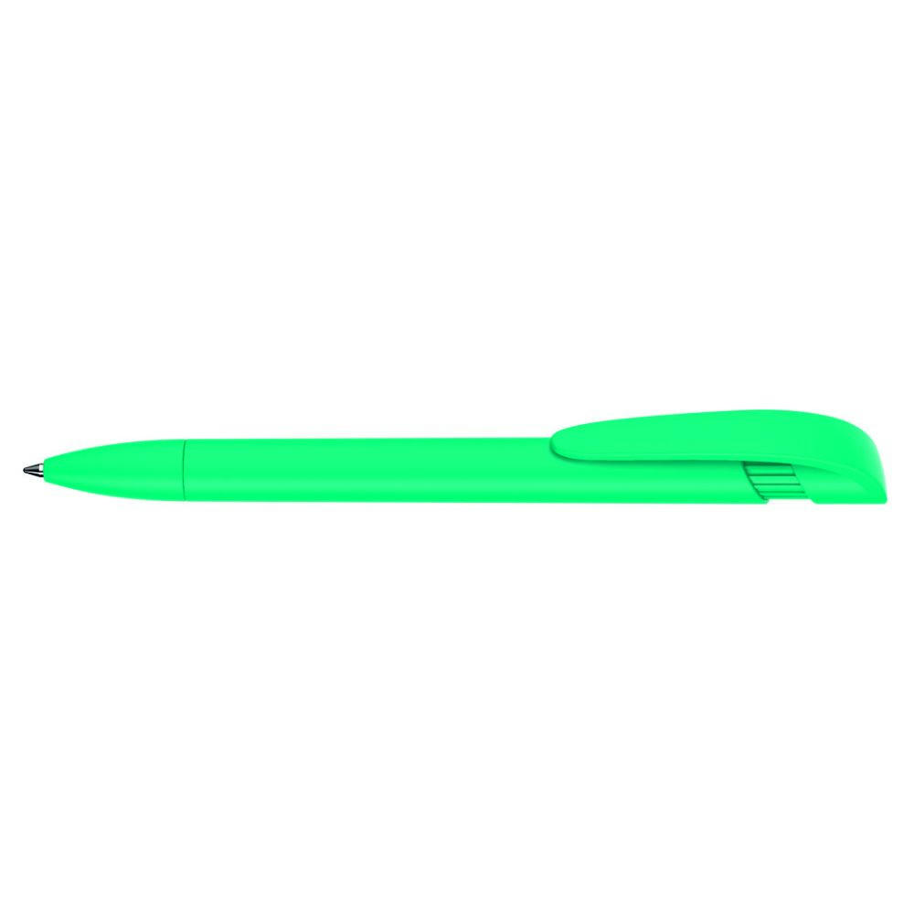 Druckkugelschreiber mit gedeckt mattem Gehäuse, breitem Bogenclipdrücker und Spitze.