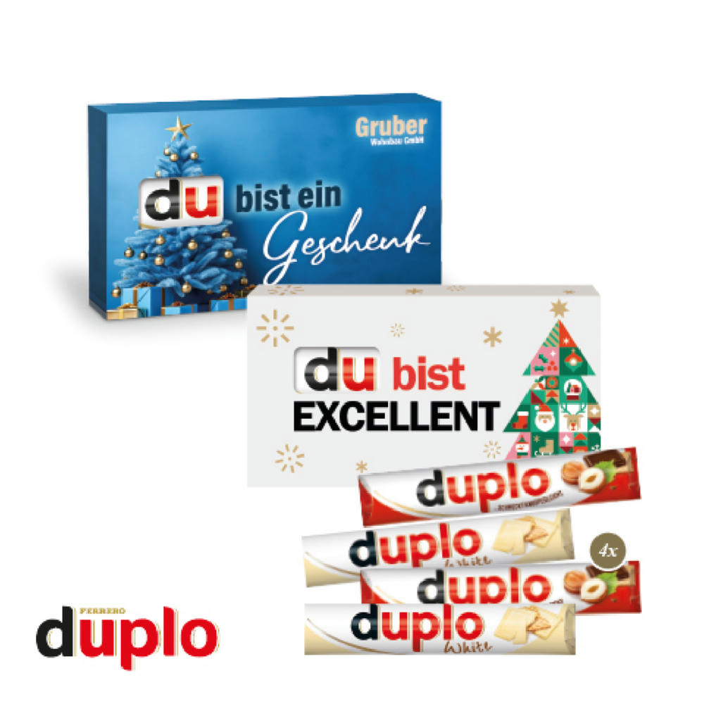 Der besonders kunsperleichte Riegelgenuss, jetzt in einem Adventskalender mit je einem duplo (ca. 72g) für jeden Adventssonntag. 2 x duplo klassisch, 2 x duplo weiß. Haltbarkeit 3 Monate. In einer Vollkartonhülle verpackt, individuell 4-farbig bedruckt.