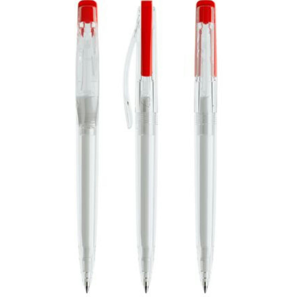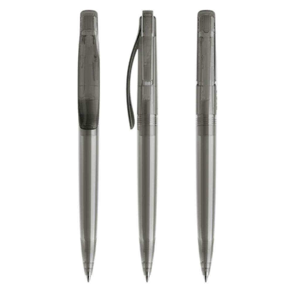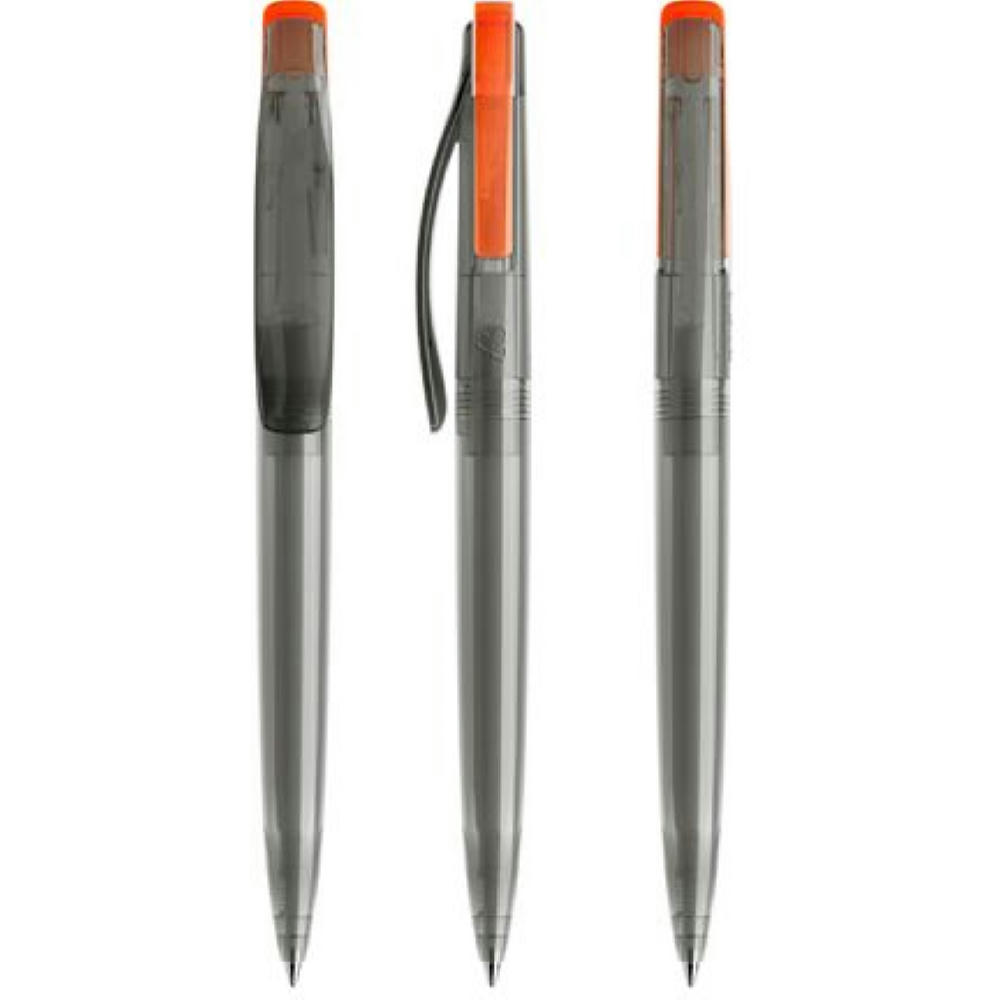 Der lang gestreckte Druckknopf verleiht ihm seine ganz individuelle Linie. Wie immer bei Prodir sind die Wände der Bauteile auf maximale Stärke ausgelegt. Das sorgt für intensiv leuchtende Farben und angenehme Schwere in der Hand. Ganz gleich von welcher Seite man den DS2 betrachtet, die Botschaft bleibt immer sichtbar. Denn beide Flügel des Druckknopfs sind bedruckbar. So lässt sich Wichtiges gleich zweimal sagen. In der Ausführung mit transparentem Gehäuse (PTT) lieferbar in zwei Standardfarben, hergestellt mit einem Rezyklatanteil von 50%, gekennzeichnet mit dem internationalen Recycling-Symbol. Sondergehäusefarben ab 10.000 Stück. Fünf Druckflächen für Werbeanbringungen stehen zur Verfügung. Der beidseitig bedruckbare Druckknopf kann vom Gehäuse abgesetzt werden. Ausgestattet mit der umweltfreundlichen auswechselbaren FLOATING BALL® lead free-Großraummine 1.0, Schreiblänge 5.000 m, Schreibfarbe Blau oder Schwarz.
