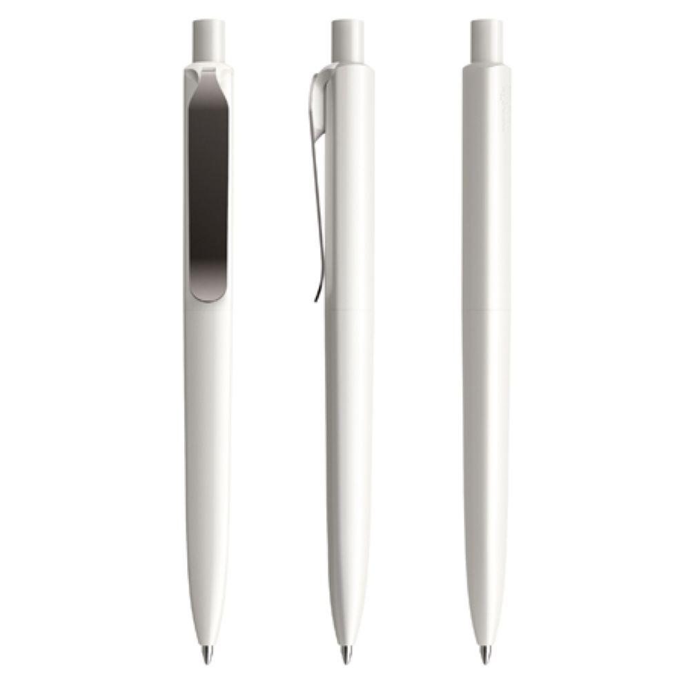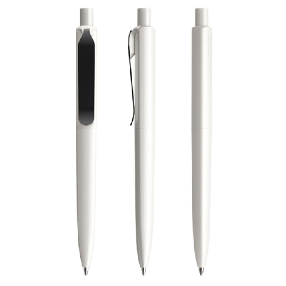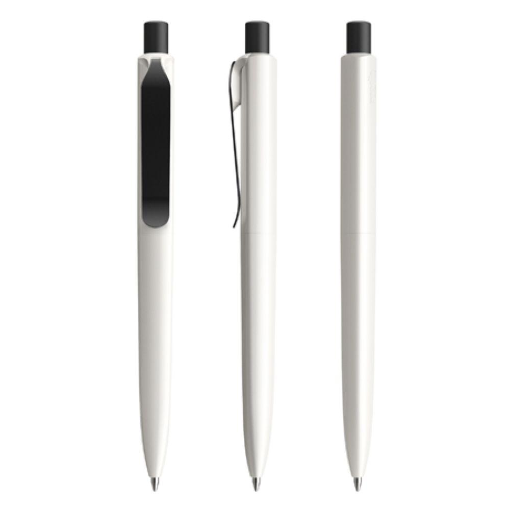 Die Ikone eines klassischen Schreibgerätes – auch mit Metall-Clip. Wertige Clip-Druckknopf-Kombinationen aus Metall machen den DS8 noch vielseitiger. Ein ausgewogener Material-Mix aus Metall und Kunststoff, der Marken gekonnt in Szene setzt. In der Ausführung mit vollfarben poliertem Gehäuse (PSP) lieferbar in fünf Standardfarben, hergestellt mit einem Rezyklatanteil von 100% (Schwarz und Weiß) oder 50% (alle anderen Farben), gekennzeichnet mit dem internationalen Recycling-Symbol. Sondergehäusefarben ab 5.000 Stück. Fünf Druckflächen für Werbeanbringungen stehen zur Verfügung. Die Standardausführung ist mit Silber satiniertem Clip ausgestattet. Als Option stehen Clips in galvanisiertem Schwarz oder Graphit zur Auswahl. Der Druckknopf ist aus Kunststoff. Ausgestattet mit der umweltfreundlichen auswechselbaren FLOATING BALL® lead free-Großraummine 1.0, Schreiblänge 5.000 m, Schreibfarbe Blau oder Schwarz.