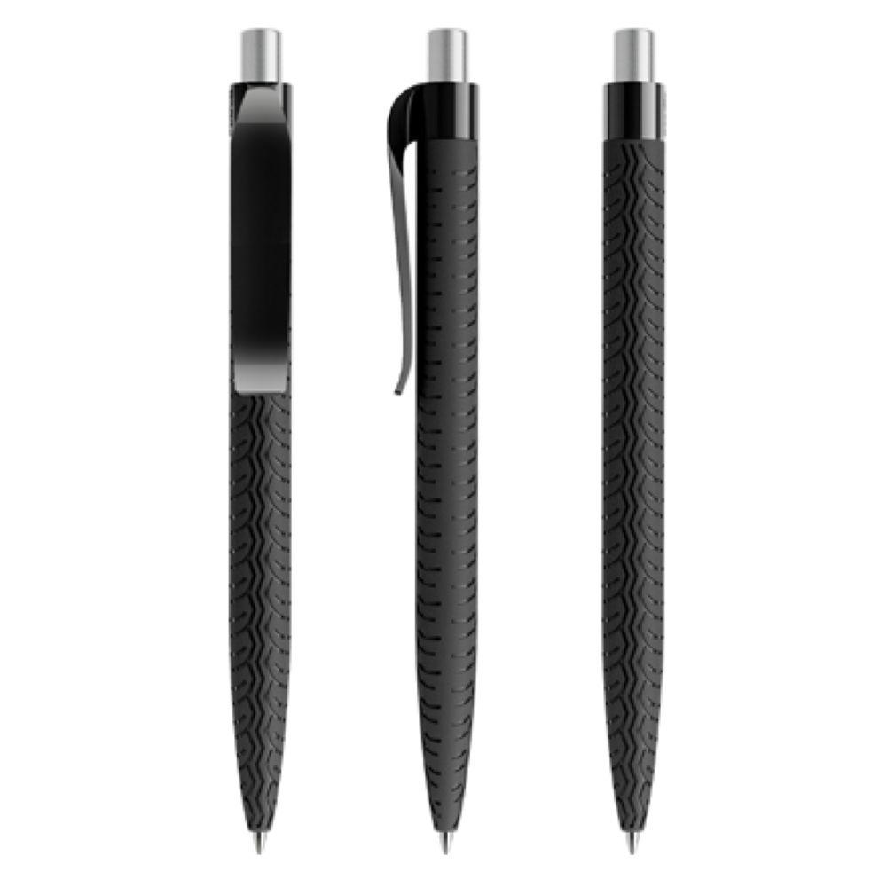 Haptik ist die neue Optik. Der QS03 zeigt eindrücklich, wie sich die 3D-Oberflächen der QS-Kollektion mit den typischen Merkmalen eines Produkts personalisieren lassen. Er sieht aus wie ein Reifen und fühlt sich an wie ein Reifen: optische und haptische Wahrnehmung formen eine klare Identität, optionales Soft Touch macht die Botschaft noch unmittelbarer sinnlich erfahrbar. Der QS03 ist ein Special-Interest-Modell für Unternehmen, die sich mit Autos und Reifen beschäftigen und das griffig kommunizieren wollen. Den QS03 mit seiner TIRE-Oberflächenstruktur gibt es in matter oder Soft Touch-Oberfläche, jeweils mit schwarz poliertem Clip/Druckknopf, hergestellt mit einem Rezyklatanteil von 100%, gekennzeichnet mit dem internationalen Recycling-Symbol. Sondergehäusefarben ab 5.000 Stück. Alternativ auch mit farbigem Clip/Druckknopf erhältlich, hergestellt mit einem Rezyklatanteil von 50%. Polierter oder satinierter Metalldruckknopf als Option. Ausgestattet mit der umweltfreundlichen auswechselbaren FLOATING BALL® lead free-Großraummine 1.0, Schreiblänge 5.000 m, Schreibfarbe Blau oder Schwarz.