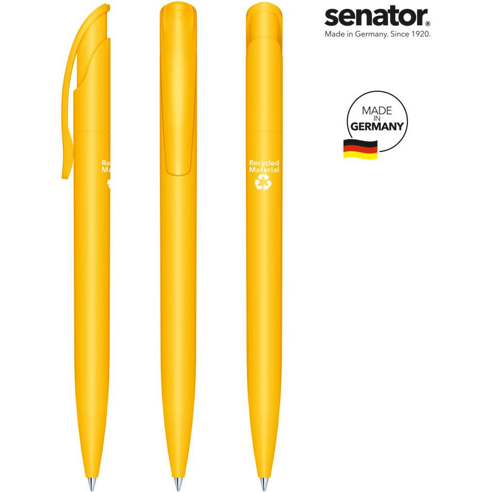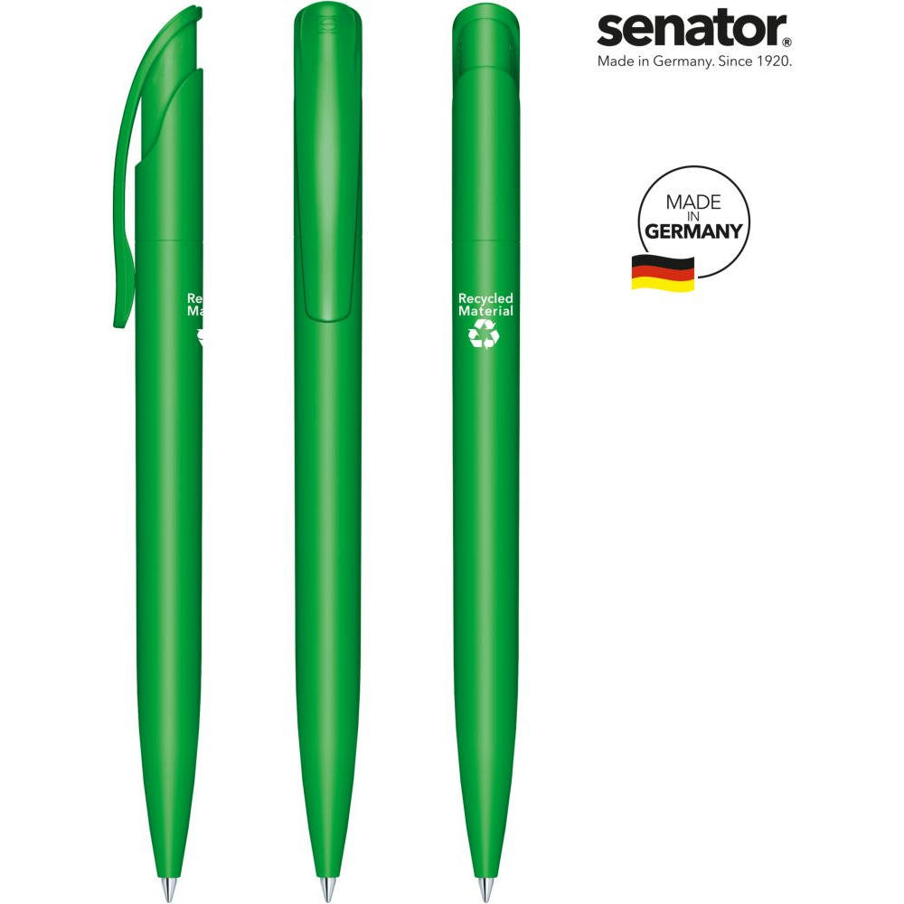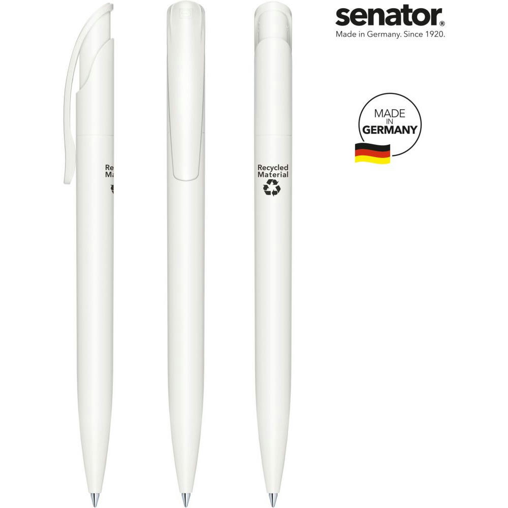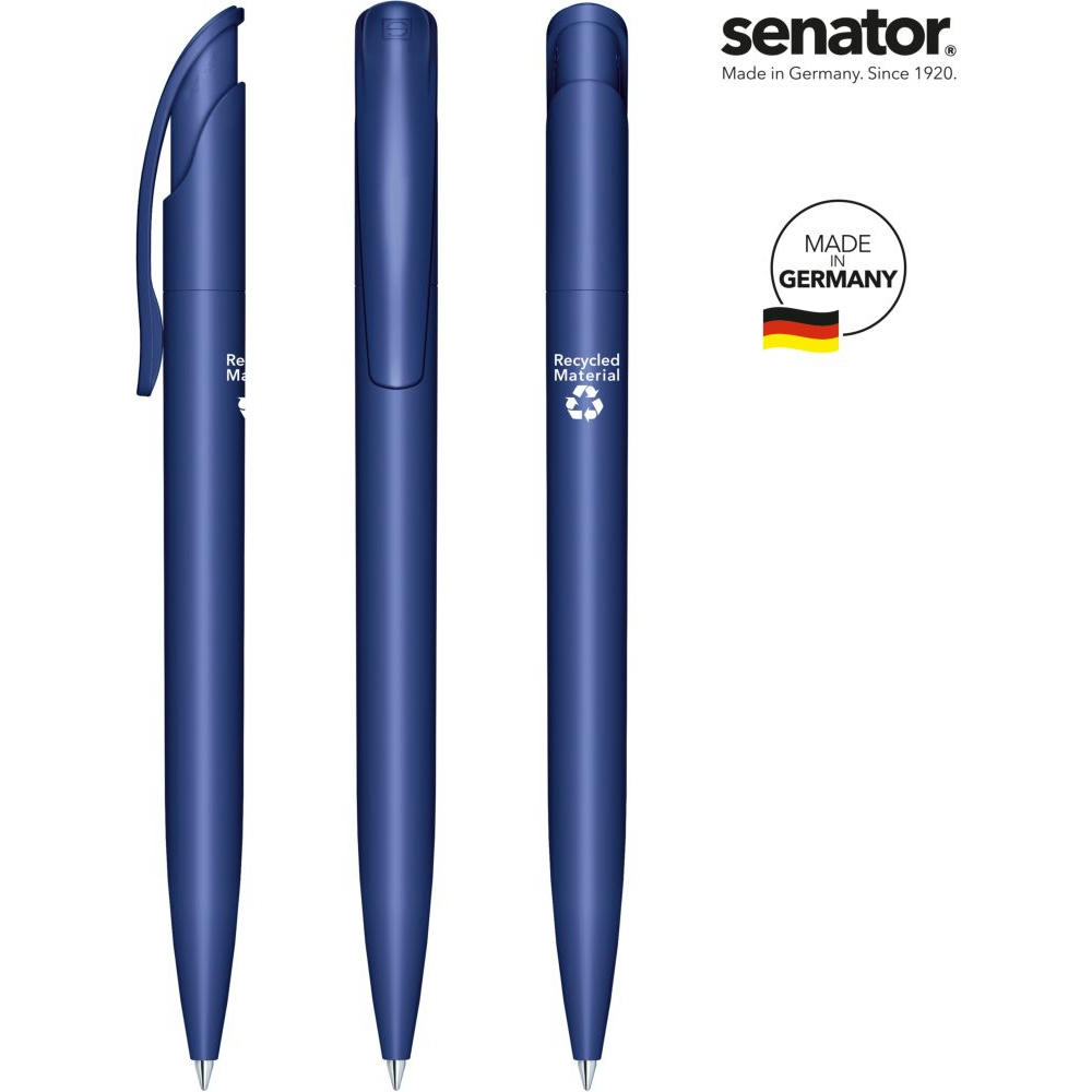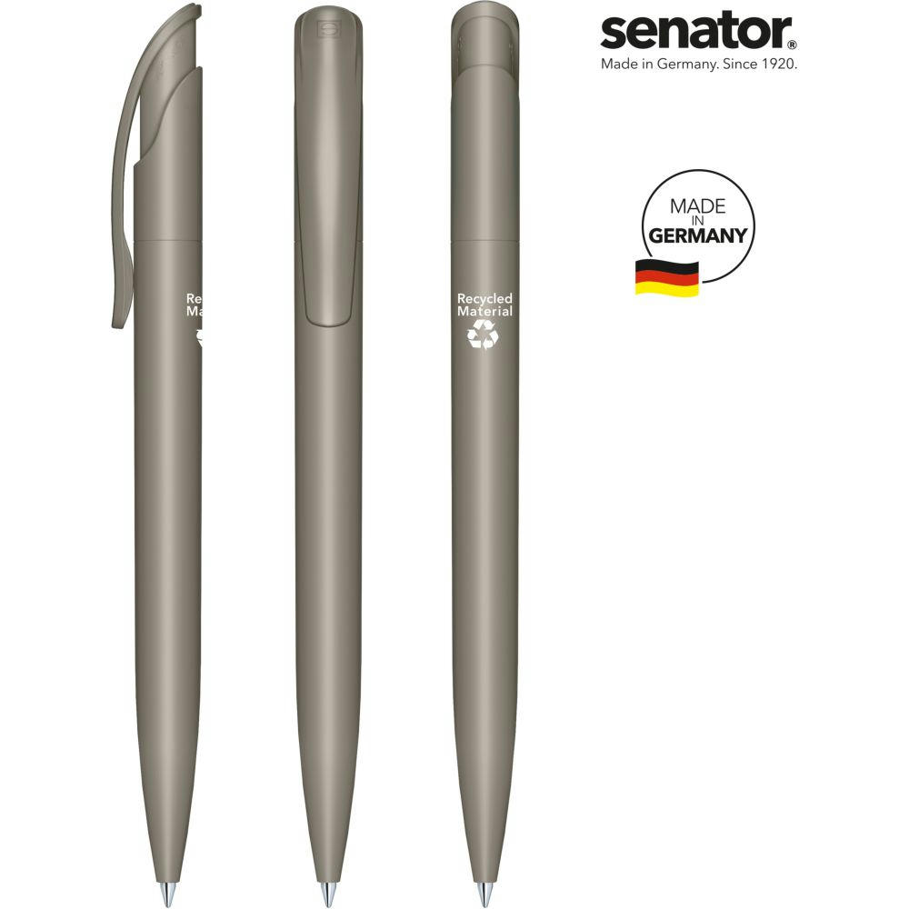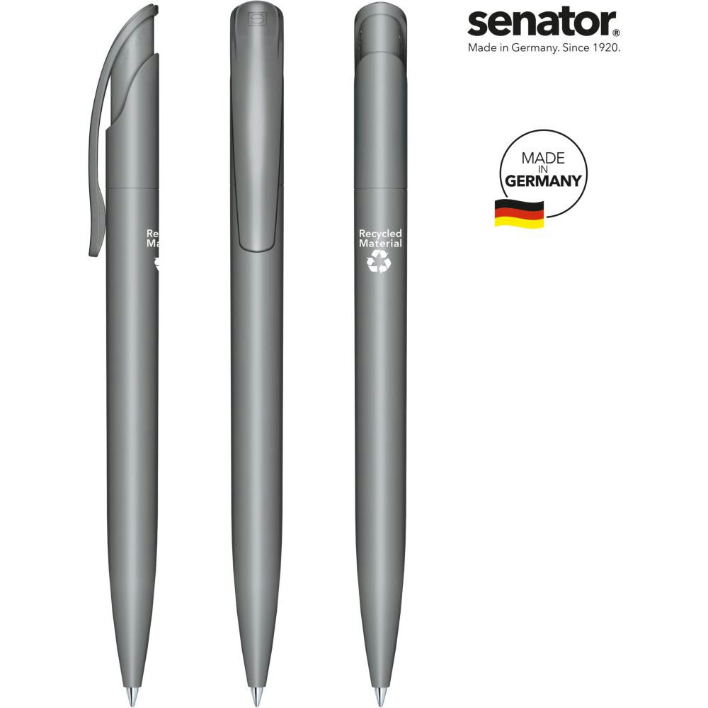 senator Challenger Matt Recycled Druckkugelschreiber. Druckkugelschreiber aus >95 % R-ABS-Recyclingmaterial, matt opak. Made in Germany. Langlebige senator magic flow G2 Mine (1,0 mm), Schreiblänge bis zu 5000 m, Tintenfarbe: Blau. Option einer kostenlosen Ersatzmine unter minen.senator.com. Jeder Challenger Matt Recycled Kugelschreiber ist auf der Rückseite mit dem Aufdruck "Recycled Material" versehen.